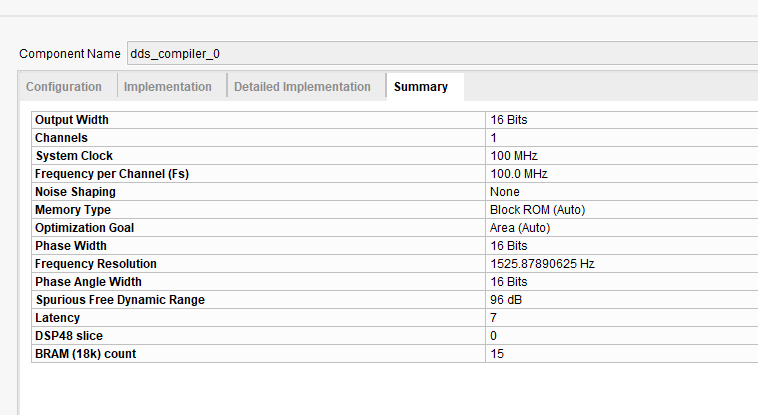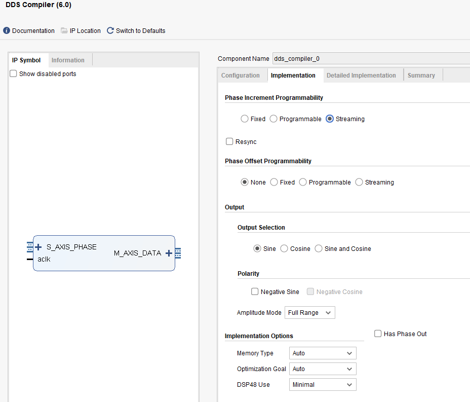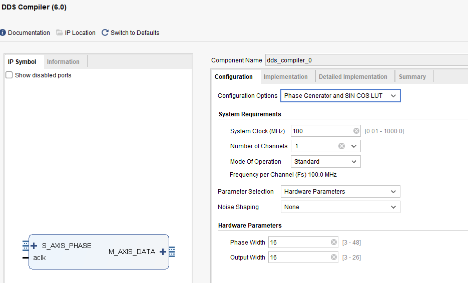 Please see the images below to understand how we configured the Xilinx DDS IP core to generate a sine‑wave sweep with a 100 MHz system clock; note that the IP core’s output interface is an AXI‑Stream, which allows seamless streaming of the generated waveform data into downstream processing blocks.