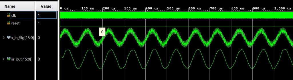 The screen shot below shows the simulation of results of the this IIR filter. The input signal is a noisy 10 KHz sine wave. You notice there are some artifacts in the filtered output signal and this is due to the truncation and round off errors. The accuracy could have been improved by using a higher scale: we could have scaled the coefficients by 2^32, but the cost here is more memory, and possibly more other resources.