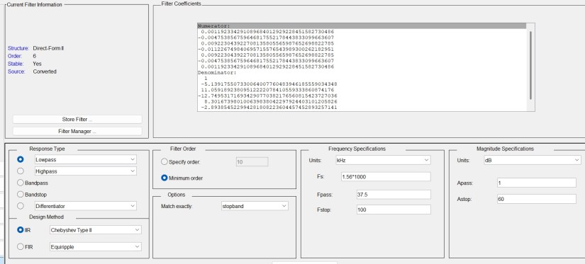 --Fs = 1.56MHz; Fpass=37.5Khz, Fstop = 100KHz; Astop = 60dB; Apass = 1dB