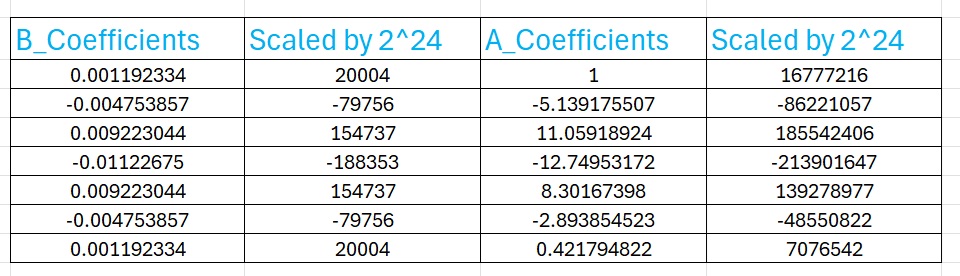 To minimize these errors, it’s essential to scale the filter coefficients to a suitable range before applying them in a fixed-point system. In our design, we chose to scale all coefficients by a factor of 224 (16,777,216). This value provides a good balance between maximizing precision and avoiding overflow during arithmetic operations.