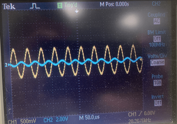 The screen shots below are real time data captured on the oscilloscope. The yellow probe is the input while the blue probe is the output of the IIR filter taken at the output of a DAC.